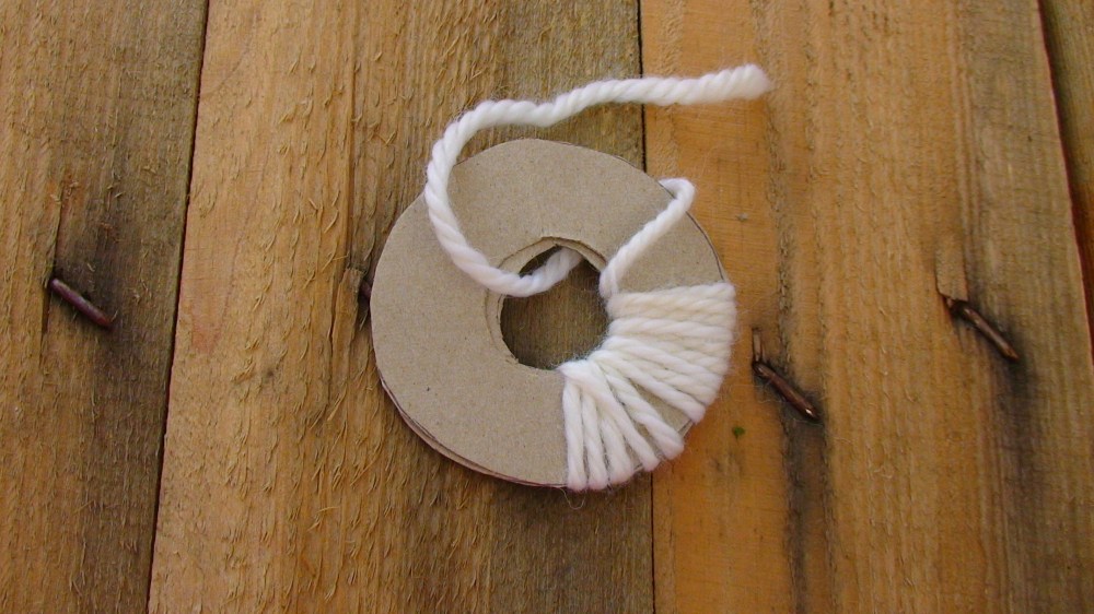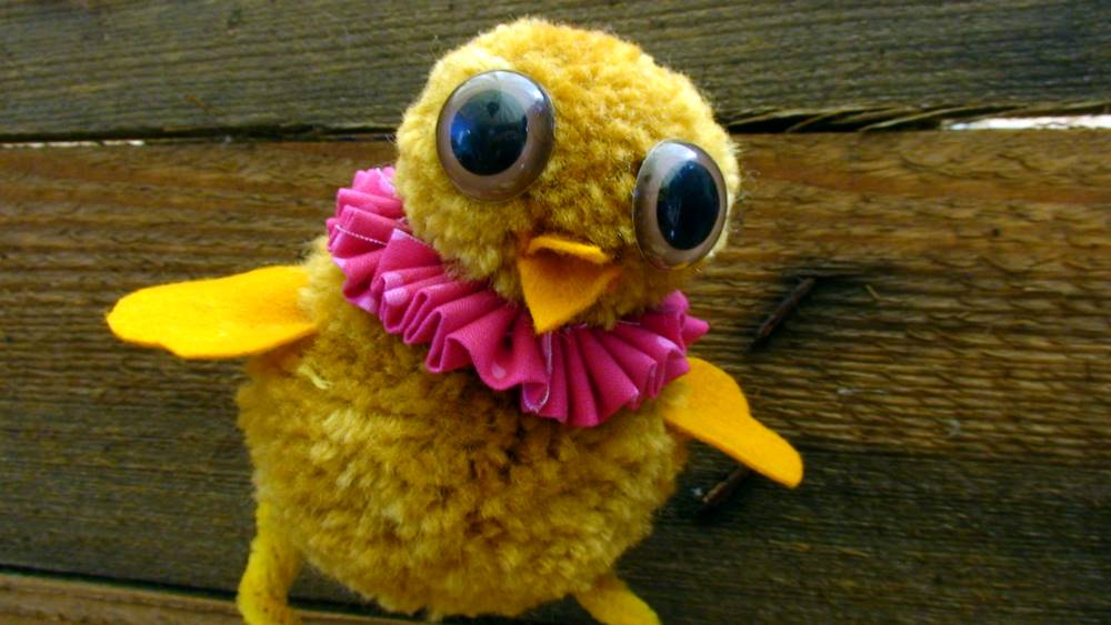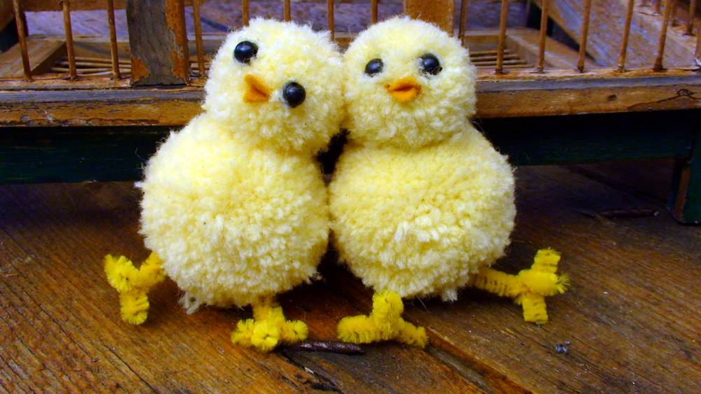 Wrap yarn around the two paper discs, then cut yarn around the disc and tie off in the center. Trim and shape pom pom to desired shapes. For the chicks you will need an oval shape for the body and a round one for the head. Same for the bunnies.
