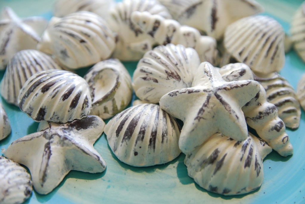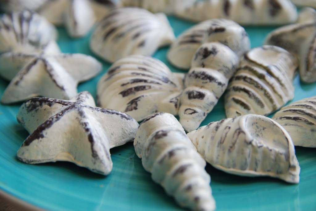 I distressed my shells to give them a worn out vintage sort of look. First I painted them black/brown then I painted over that with white chalk paint.