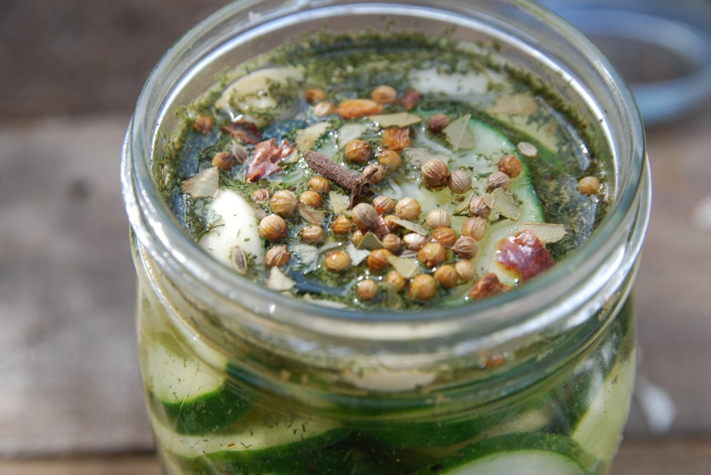 Then pack everything into a glass jar then pour brine over it all until all ingredients inside are submerged. Tap it to remove any air bubbles then add lid and store in fridge. They should store for up to two months.