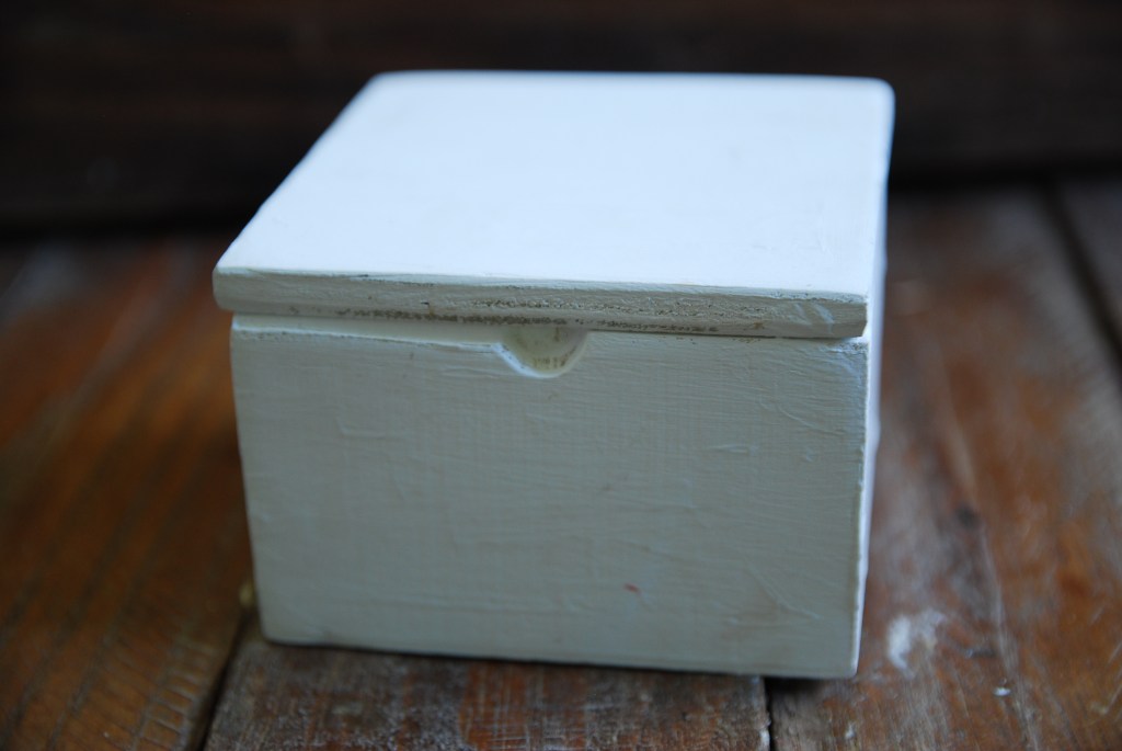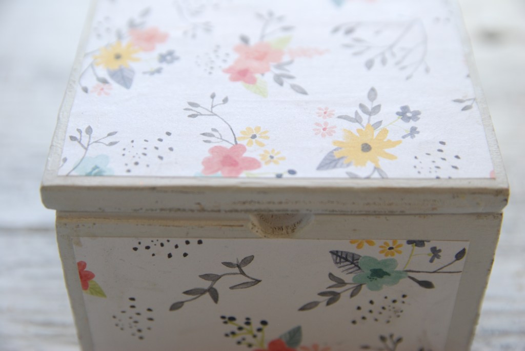 Found this little box on one of my dollar day thrift store days. It was a brown /yellow color so I painted the whole thing white and then decoupaged it with some pretty floral paper.