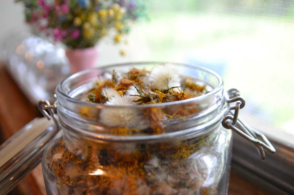 Use fresh clean and organic Dandelion blossoms and leaves-rinse well and fill a jar full of them, making sure to not pack too tightly. Pour apple cider vinegar over the fresh plant matter until jar is filled. Cover the top of jar with wax paper or plastic wrap and then a lid. This added layer keeps the acidity from the vinegar from eating away at the metal lids. We have plastic lids for some of our canning items that use vinegar in their recipes to prevent that from happening. Place the covered jar in a dark cabinet and store for 4-6 weeks, shaking occasionally. Strain and it’s ready to use, dilute with equal parts water and use as a hair rinse. Or you could dilute with water and dab on itchy bug bites.