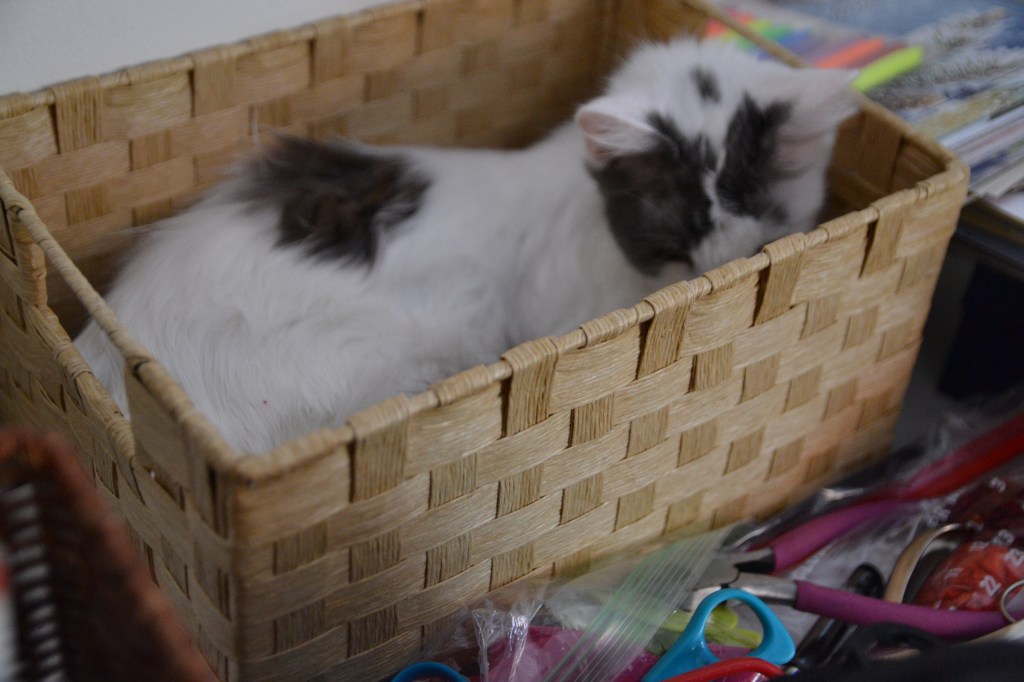 When I was packing them up for delivery I noticed my little rescue cat was missing, so off I went searching for Alley cat. Years ago we found her in the alley back in the city where we lived. She was left by the garbage and moving boxes that had been dumped illegally in our alley. My dad used to call her a tiny thing.