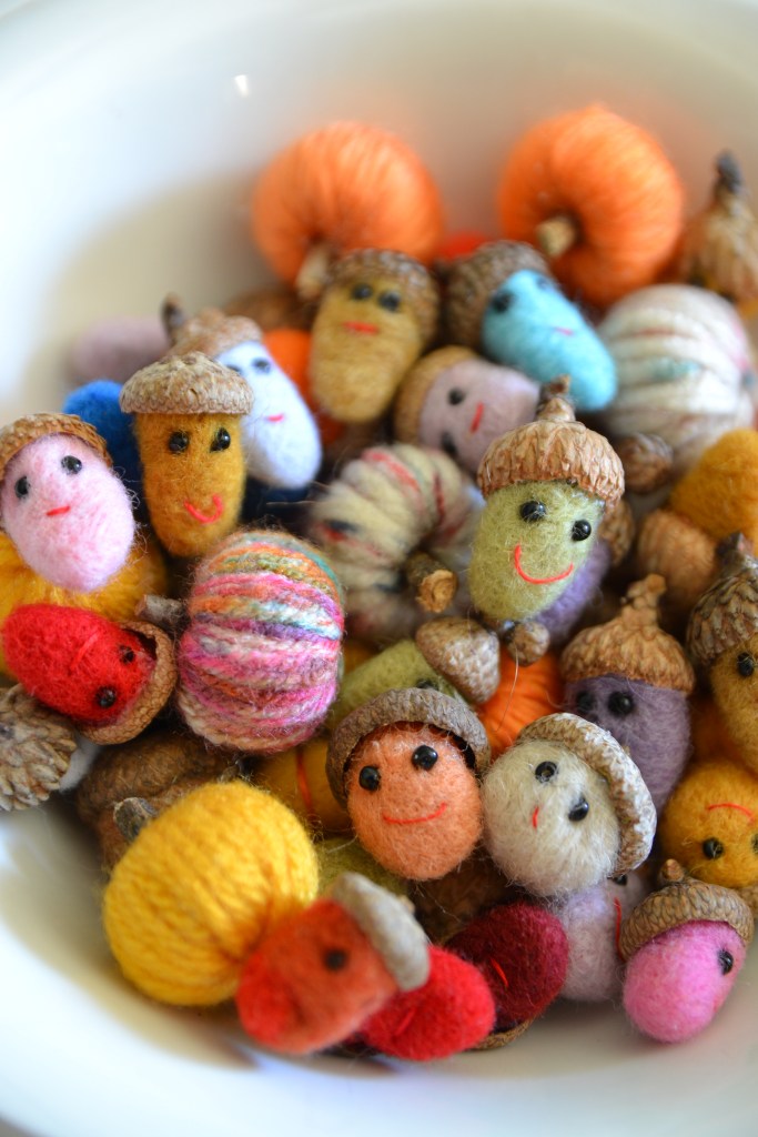 Back to my DIY, these felted acorns are super easy to make. Just needle felt simple round balls and glue into acorn tops, then sew little black beaded eyes on them and a tiny mouth with embroidery thread.