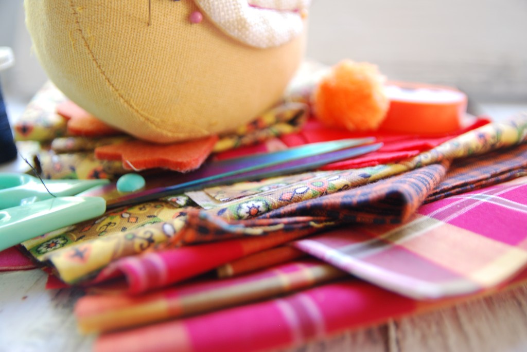 Cut strips of fabric for different sizes of pumpkins. 3X6, 4×8, 6×12. Three inch width and six inch length and so on. Sew up one side using a back stitch or on sewing machine inside out. Turn right side out after stitching and then sew bottom using a running stitch. Pull stitch tight then tie of once you have sewn around whole bottom. Stuff with cotton stuffing then repeat step by sewing top with running stitch, pull tight then tie off top.