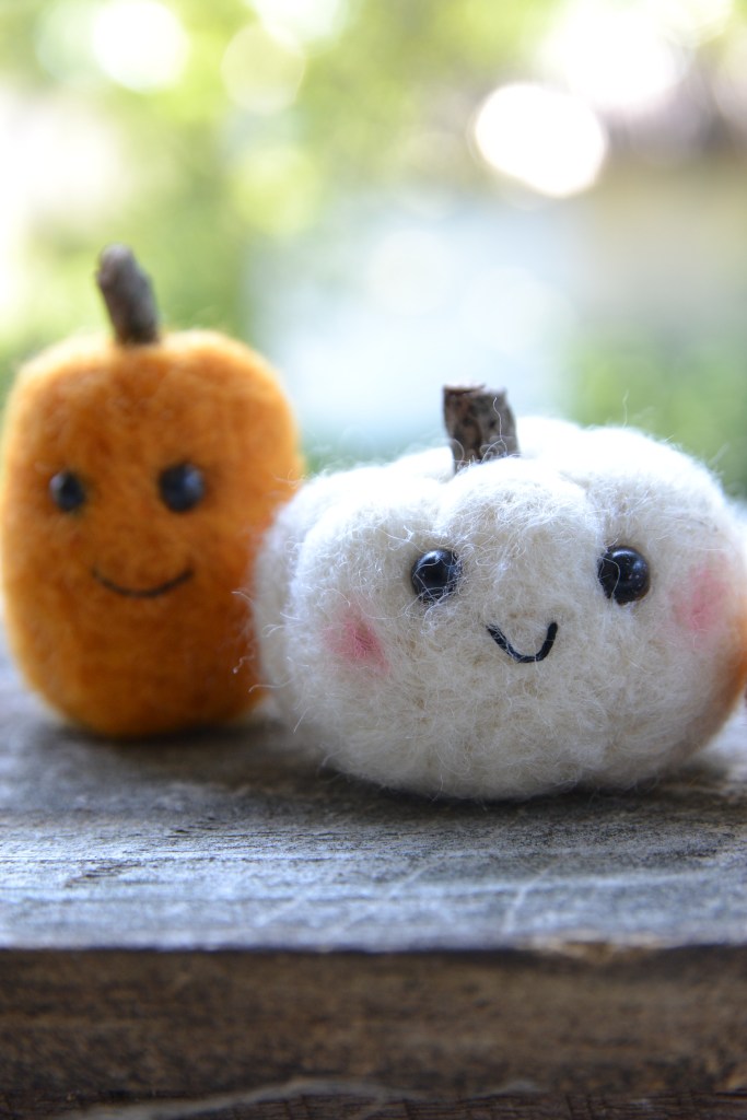 These are designs based off of Japaneses toys that are so adorable to me. I don’t remember the name but their faces are so sweet and happy looking. Needle felting pumpkins is so easy. Pumpkins are perfect for beginners. Basically you’re just felting a round shape and then adding curves and a small indent at the top to add a little branch.
