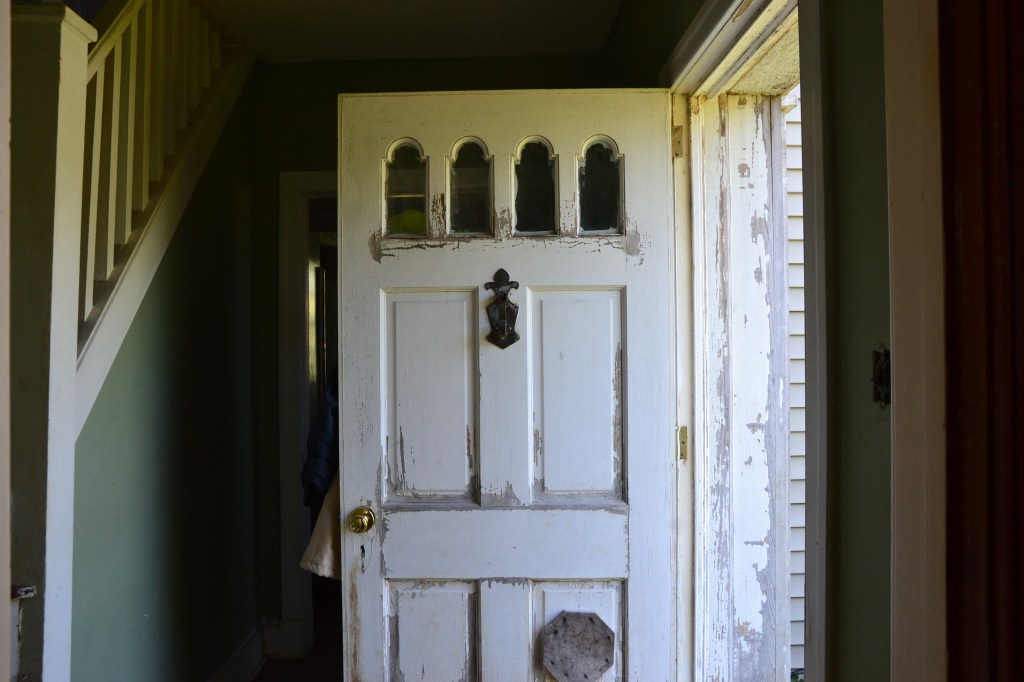 Now that I’m thinking about this…I may keep this old look of the door. It has become it’s character in a way. Of course the bottom needs some work as the original owners drilled a hole in it for a washing machine downstairs. The washing machine used to be in the basement and when the grandma got older it was really hard to walk down and up all those stairs. Going up and down the three levels can wear out those knees.