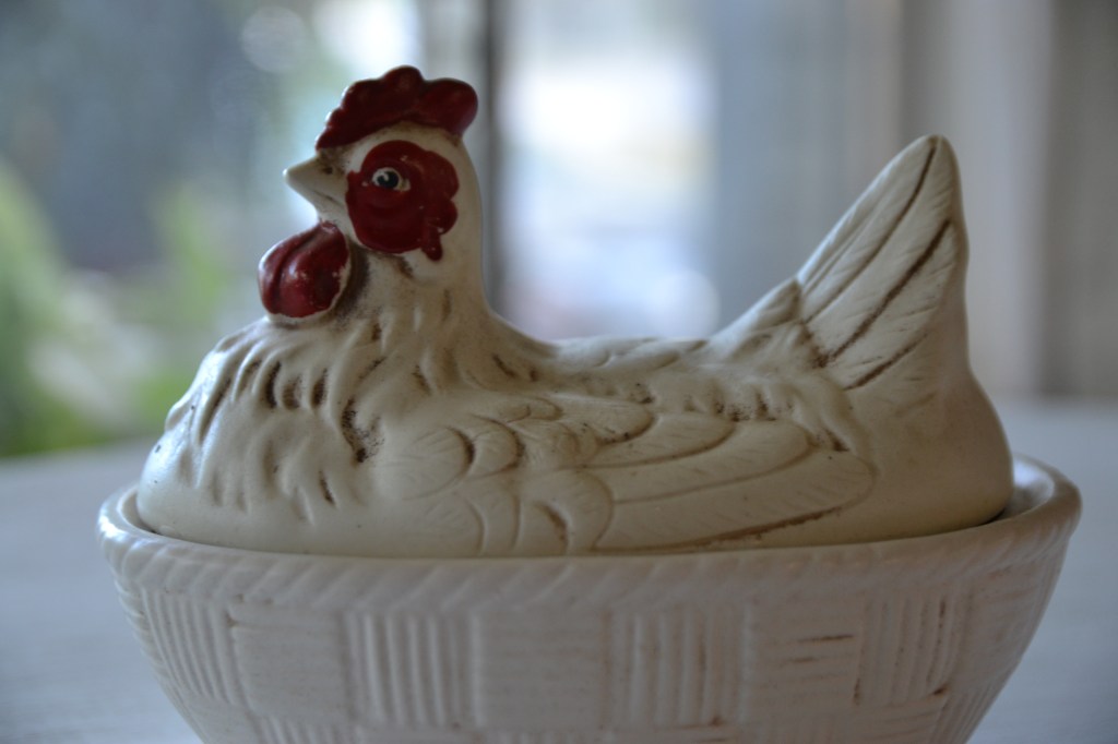 I bought a long beige cardigan sweater for my daughter ($1), several baskets (ranging in prices of .50 cents to $2), some tiny kid prizes (.10 cents to .25 cents each), A ceramic chicken ($3), a ceramic chicken pitcher ($1), Cast iron bunny ($1). Cast iron llama family ($3), Wooden vintage Christmas ornaments (.50 cents to $4) a bunny vase ($1), some old tins and a glass bottle ( .25 cents each) Puzzle books (.10 cents each) and a really pretty acrylic heart (.50 cents) .