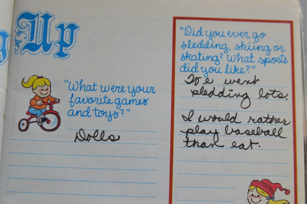 Grandma’s favorite toy were her dolls. She went sledding a lot as a child and loved baseball so much that she rather do that than eat.