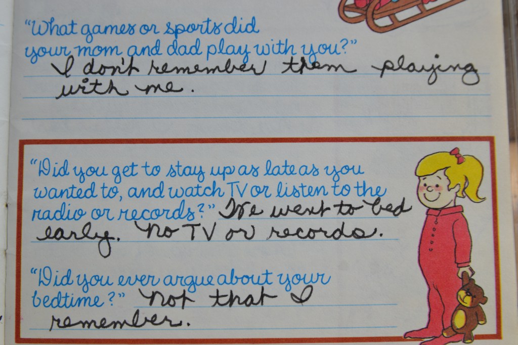 She doesn’t remember her mom or dad playing any games or sports with her. She didn’t get to stay up late, they went to bed early, no TV or records. And she doesn’t remember arguing about early bedtimes.