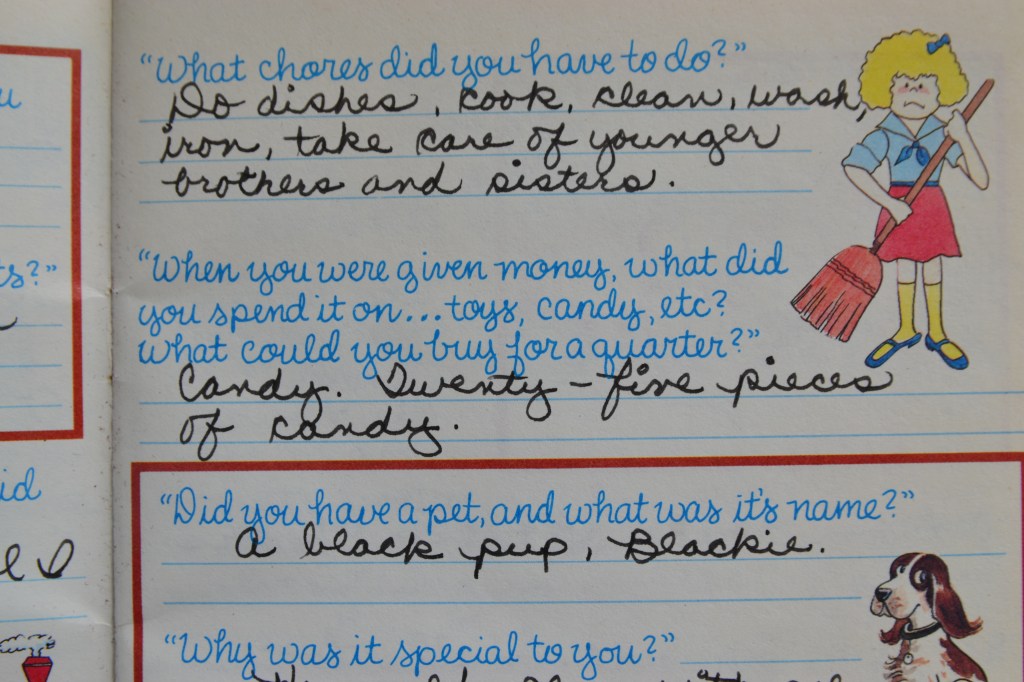 We’ve been finding all kinds of fun items at the historic home. Items from decades ago in some cases. It’s like a treasure hunt every time we come across something from the past. This week we found a little journal that a grandchild gave to their grandma to fill out.