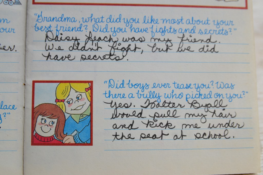 Grandma’s best friend and her never fought, and they kept many secrets. There was a bully in school that picked on her, pulling her hair and kicking her under the seat at school.