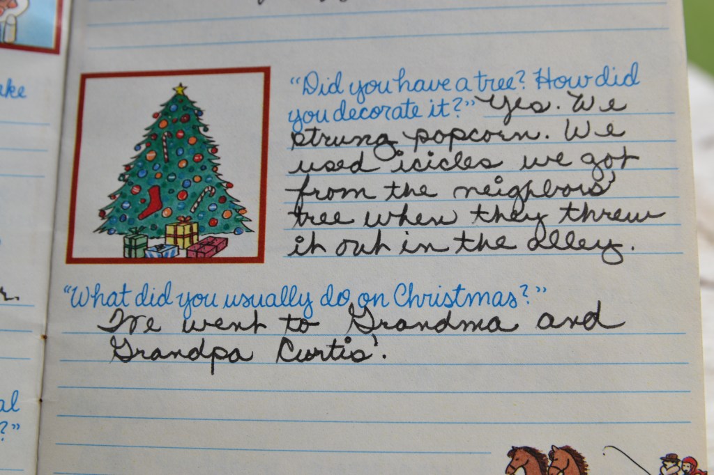 Grandma decorated her tree with popcorn and icicles. They got their tree from their neighbors when their neighbors threw their tree away in the alley. And just like celebrating Thanksgiving at her grandparents house, they also celebrated Christmas there as well.