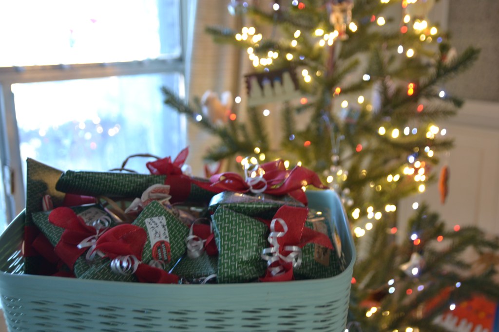Last week we wrapped up all kinds of little surprised gifts to drop off at different locations around town for children to find. Secret Santa gifts of small inexpensive packages of tiny toys, stuffed teddies, chocolate candy and peppermint sticks. They’re craft projects and puzzle kits wrapped up. The craft sets are those diamond art kits. For the teens there are little boxes of colored nail polish, stickers, face masks and a variety of socks. The packages are label by age so who ever finds it knows it’s for a child or a teen.