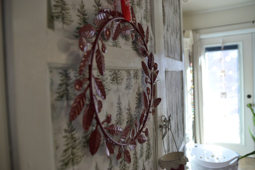 For my home I used a red metal wreath that I bought years ago at an after Christmas sale…it works. Maybe I can make another wreath later.