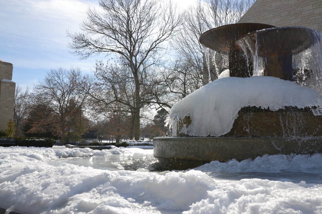 Tiny footprints around the fountain. Little kids out of school exploring this Winter Wonderland.