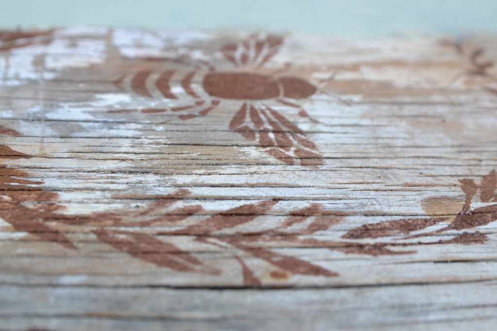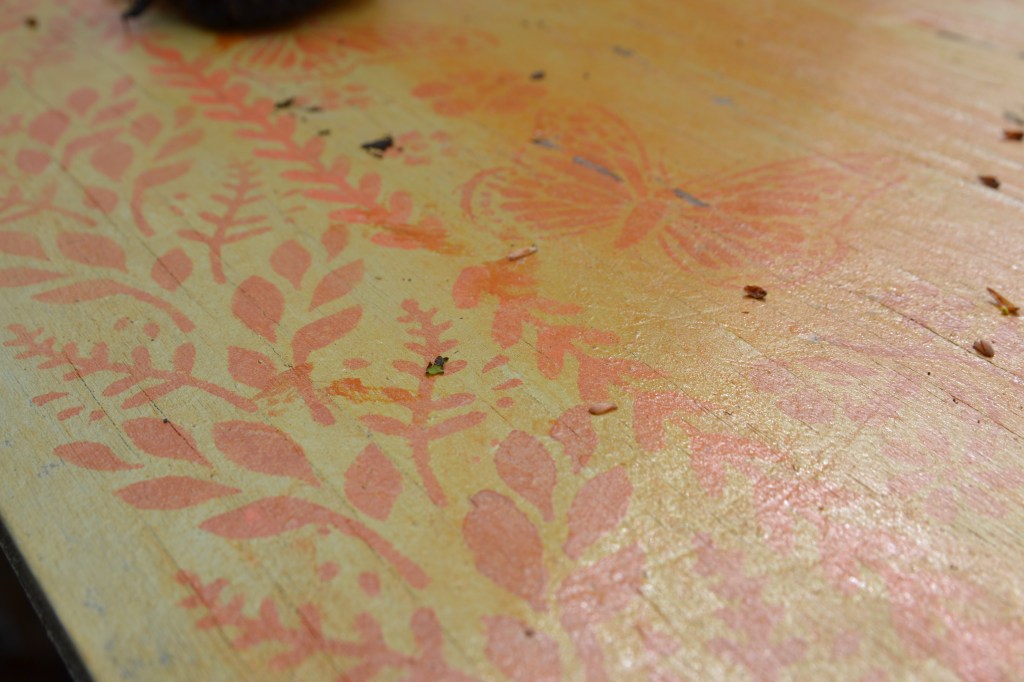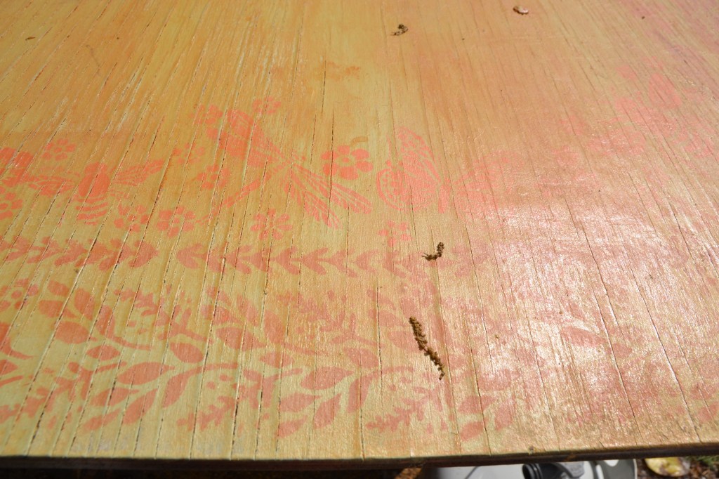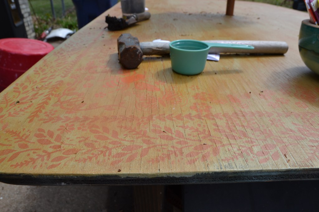 I also redid our huge outside garden table, painted and stenciled that over. The wood was so dry and needed to be completely painted over. I wanted to stencil over the warn and rustic looking wood, but I needed to protect the table, so I painted and weather proof that as well. I have two more steps to complete it. One more darker stain to bring down the yellow/orange color and then seal and weather proof that.
